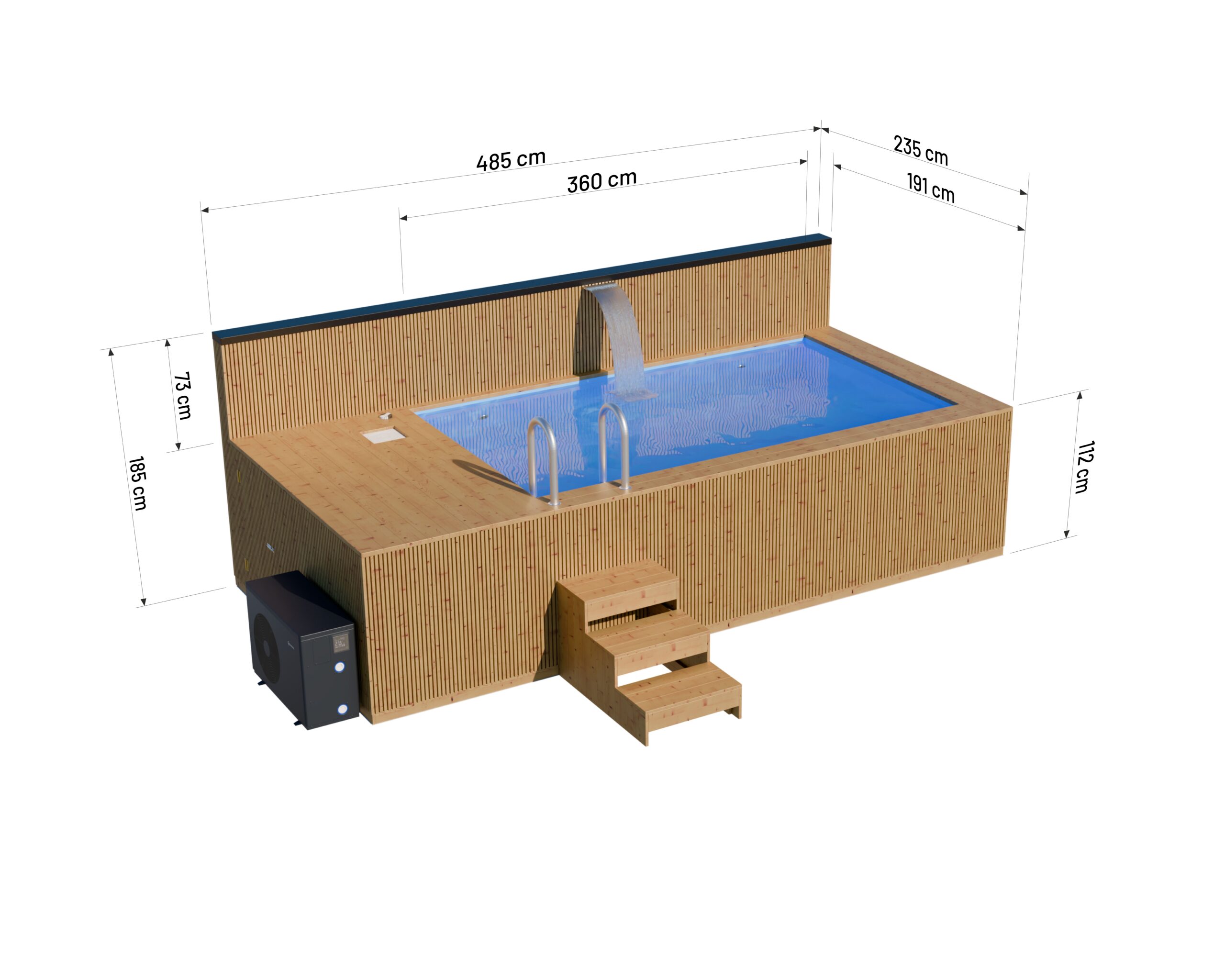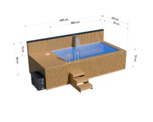 Wizualizacja basenu o wymiarach 4.8 x 2.3 m z piecem i wkładem, model Thermo, widok z perspektywy. Bez impregnácie