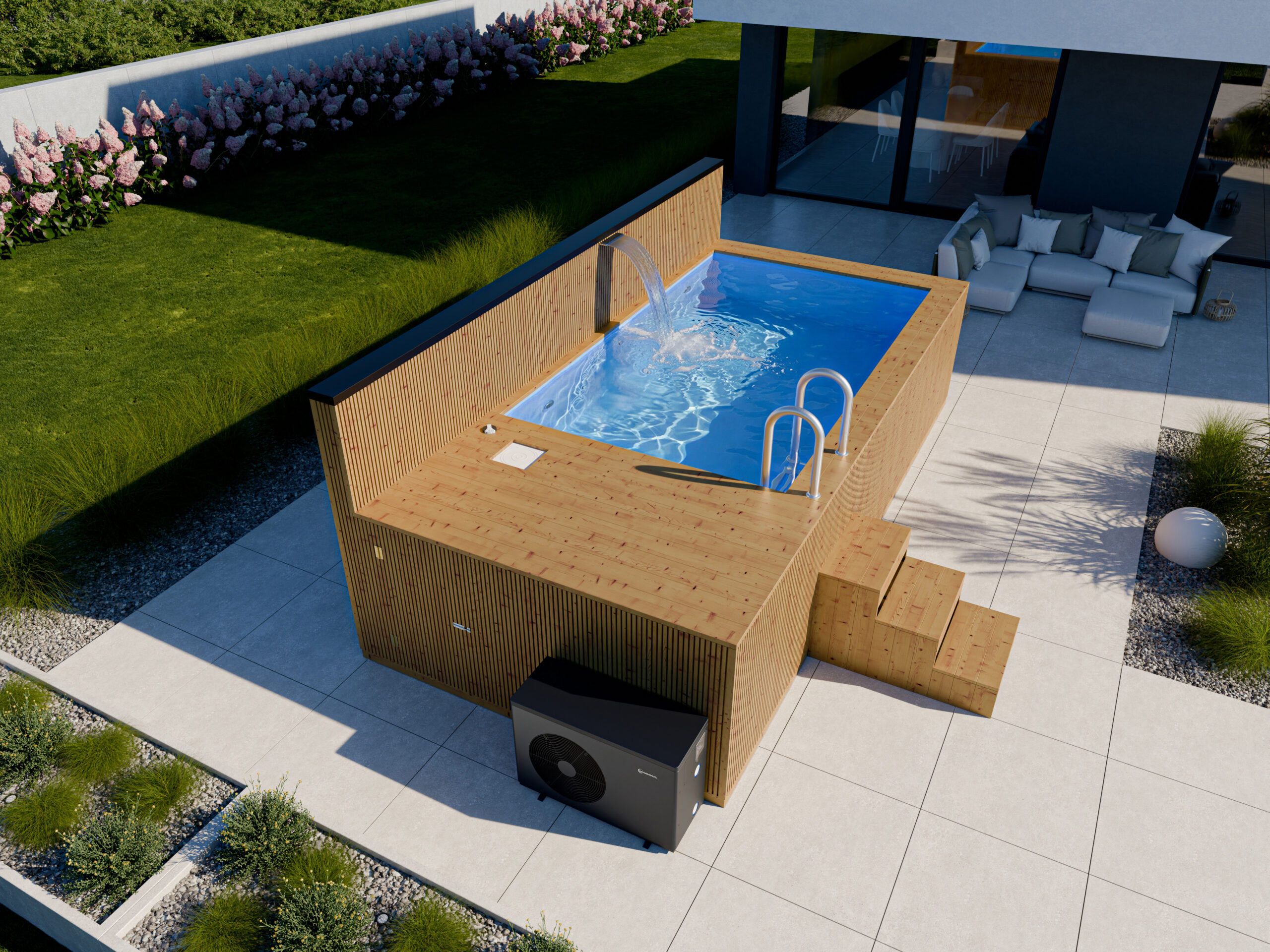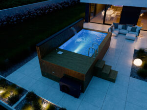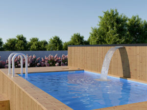 Wizualizacja basenu o wymiarach 4.8 x 2.3 m z piecem i wkładem, model Thermo, widok z perspektywy. Bezfarebný