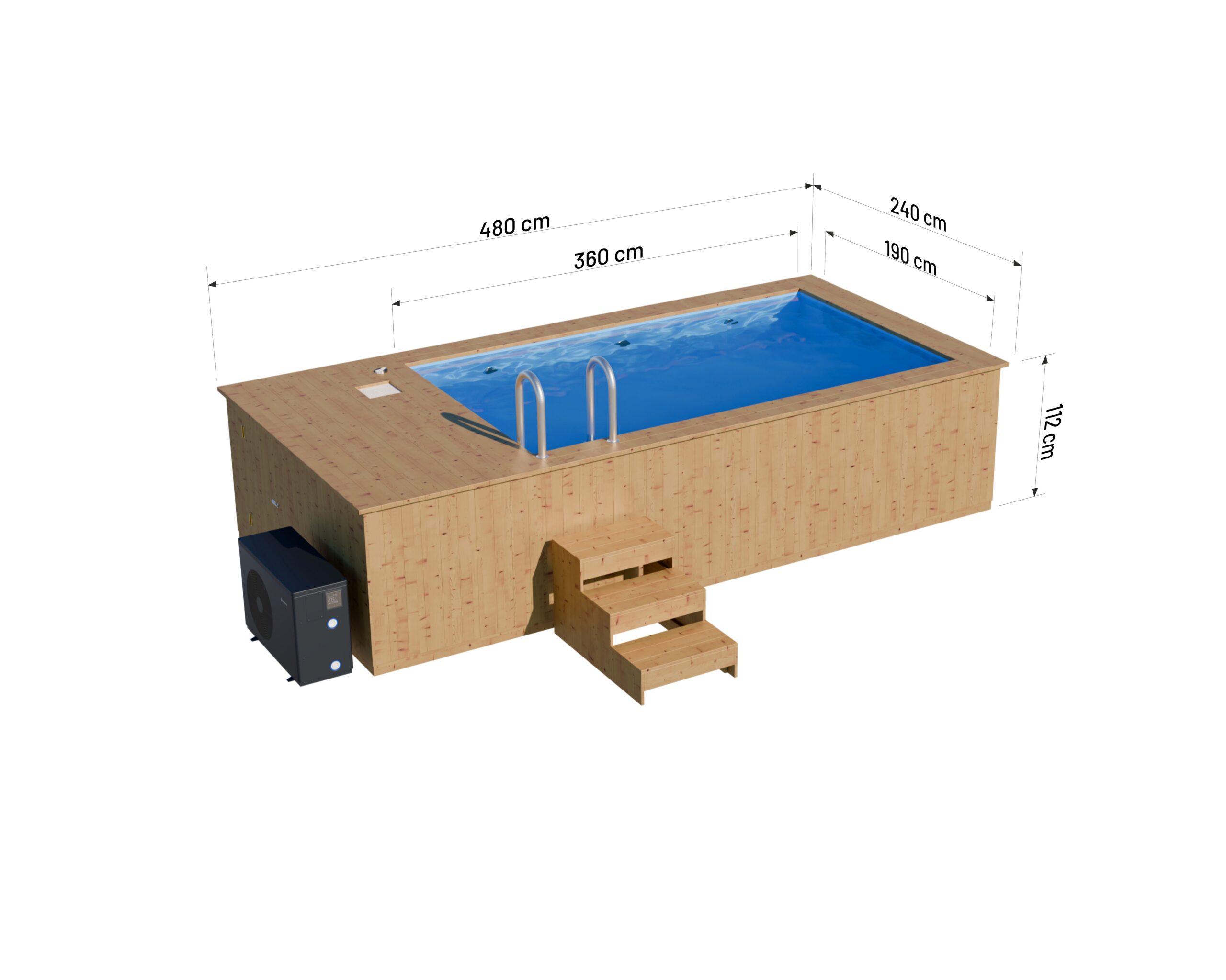 Bazén s rozmermi 480 x 240 cm a objemom 5 000 litrov poskytuje veľký priestor na kúpanie a relaxáciu. Vyrobený z masívneho smrekového dreva. Tvrdé drevo, sušené v komore. Hrúbka dosiek 44 mm. Vnútri vložka z polypropylénových vlákien. Bazén od A&M obsahuje schodíky, pieskový filter (6 m³/h) a možnosť pridať externú pec na drevo alebo 4 kW tepelné čerpadlo.