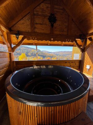 Sauna je vyrobená z najkvalitnejších materiálov, ktoré zaručujú trvanlivosť, estetiku a odolnosť voči poveternostným vplyvom. Zabudovaná vírivka dodáva jedinečnému charakteru tohto apartmánu ďalší prvok luxusu. Vďaka starostlivo premyslenému dizajnu sauna dokonale zapadá do okolia záhrady a pôsobí moderne a elegantne.