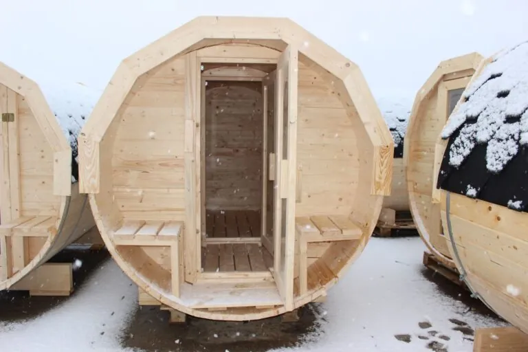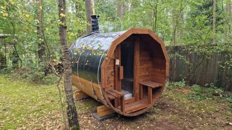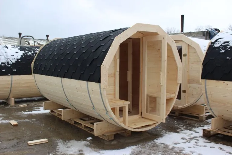 Sauna je vyrobená z poľského smrekového dreva a 45 mm hrubých dosiek, má predsieň s lavicami a priestranný interiér. Rozmery sauny: 350 cm dlhá a 200 cm vysoká, s lavičkami a podlahou vo vnútri. Dvere s tvrdeným sklom. Strecha pokrytá šedým asfaltovým šindľom. So 4 kovovými upínacími skružami a 3 drevenými podstavcami.